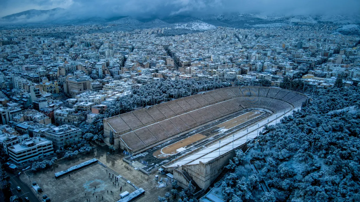 Griechenland - Athen, Schneefall in der griechischen Hauptstadt, Attika, Momentaufnahme am Montag, 6. Februar 2023. Die Schlechtwetterfront Barbara ist in vollem Gange, was das Land seit Samstagabend mit niedrige Temperaturen, starkem Frost, stellenweise dichten Schneefällen in Gebieten Ostgriechenlands sowie stürmischen Nordwinden mit einer Stärke von 8 bis 9 Beaufort auf den Meeren zu spüren bekommt. Im Bild: Verschneites historisches Panathenäisches Stadion von 1896 in Luftansicht Schnee in Athen und Attika *** Greece Athens, snowfall in the Greek capital, Attica, snapshot taken on Monday, February 6, 2023 The bad weather front Barbara is in full swing, which the country has been feeling since Saturday evening with low temperatures, ANE5799325,Image: 754402914, License: Rights-managed, Restrictions: imago is entitled to issue a simple usage license at the time of provision. Personality and trademark rights as well as copyright laws regarding art-works shown must be observed. Commercial use at your own risk.;PUBLICATIONxNOTxINxGRE, Credit images as "Profimedia/ IMAGO", Model Release: no