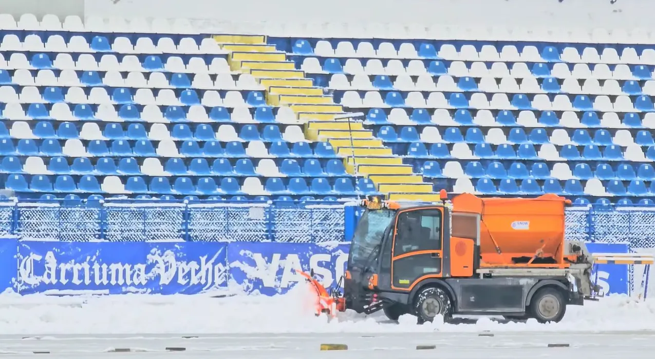 Cum arăta terenul celor de la Poli Iași înaintea meciului cu Universitatea Cluj. „În cursul nopții s-a depus un nou strat de zăpadă”