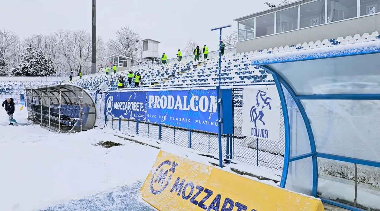 Cum arăta terenul celor de la Poli Iași înaintea meciului cu Universitatea Cluj. „În cursul nopții s-a depus un nou strat de zăpadă”