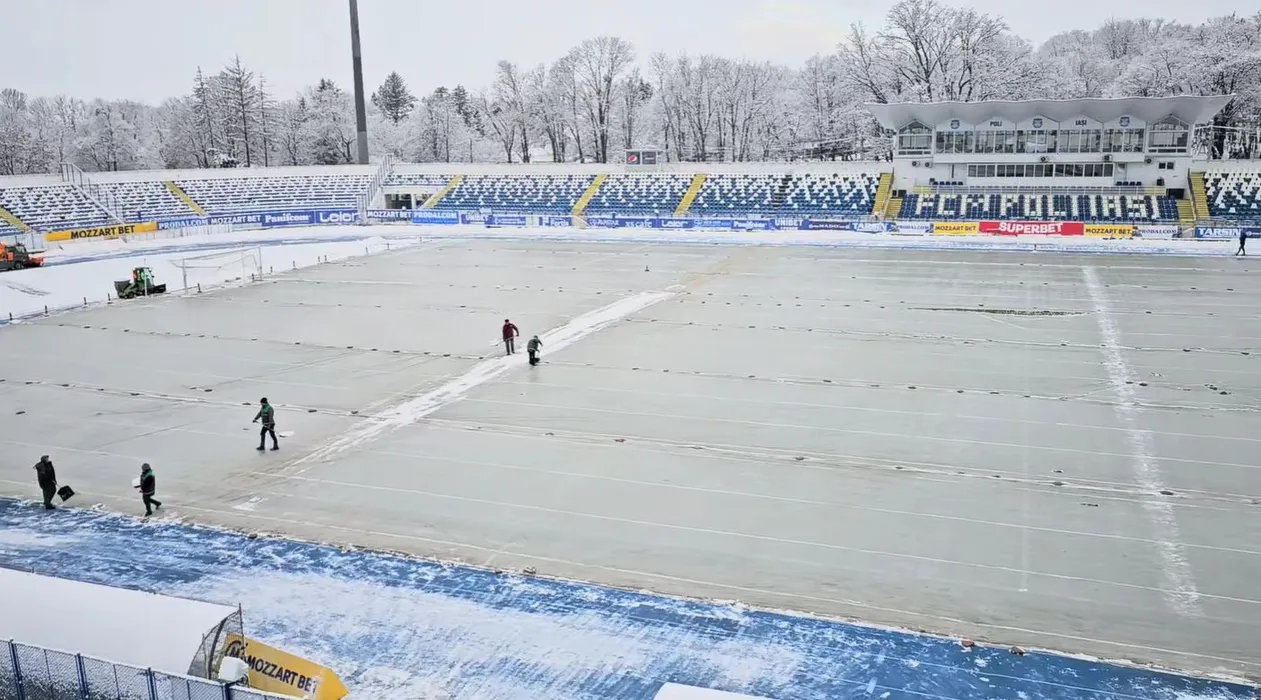 Cum arăta terenul celor de la Poli Iași înaintea meciului cu Universitatea Cluj. „În cursul nopții s-a depus un nou strat de zăpadă”