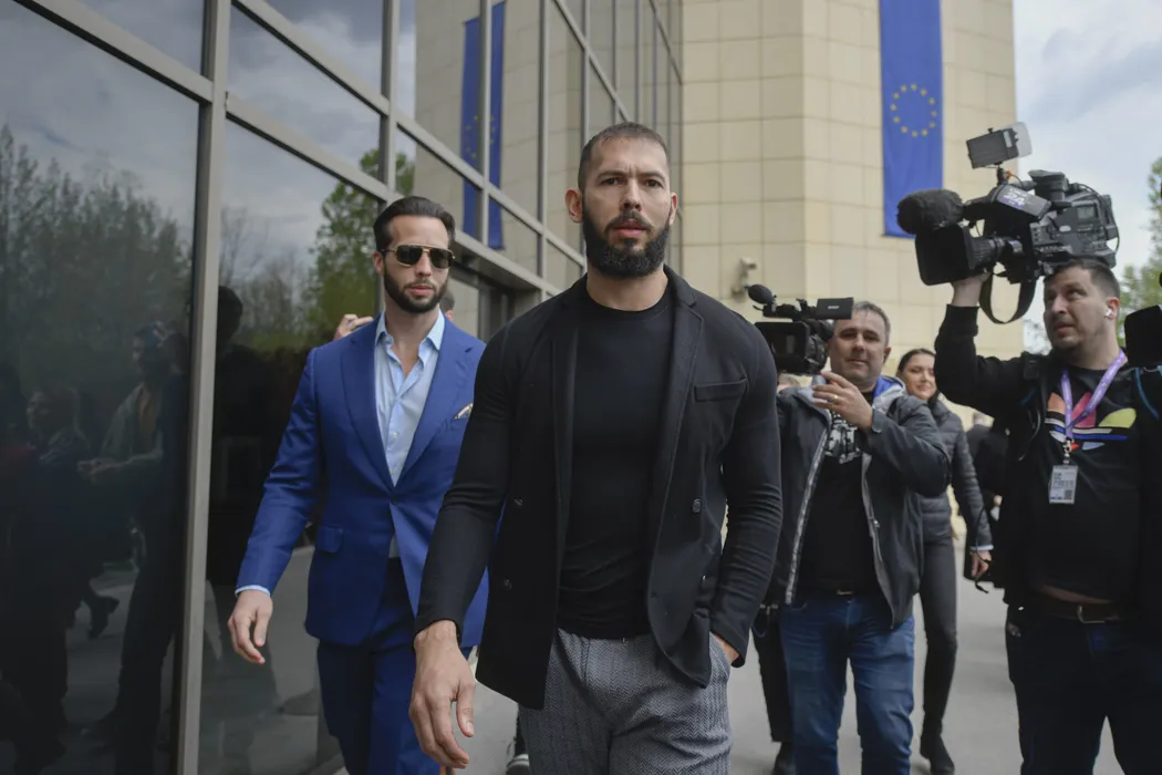 Andrew si Tristan Tate, aflati in arest la domiciliu intr-un dosar de trafic de persoane, parasesc Tribunalul Bucuresti, vineri, 21 aprilie 2023. ALEXANDRU DOBRE / MEDIAFAX FOTO