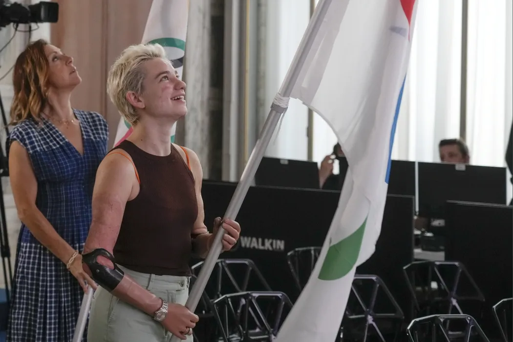 Olympic champions Deborah Compagnoni, left, and Bebe Vio carry the Olympic and Paralympic flags prior to the start of a ceremony to present the next Winter Olympics Milano Cortina 2026 to the Italian institutions at the Foreign Minister headquarters in Rome, Wednesday, June 8, 2022. (AP Photo/Gregorio Borgia)