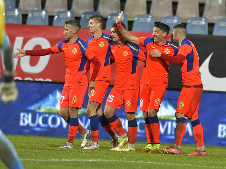 Bucurie a fotbalistilor stelisti dupa un gol marcat cu Darius Dumitru Olaru, Florin Lucian Tanase, Ovidiu Ioan Perianu si Claudiu Andrei Keseru in meciul de fotbal dintre FCSB si CS Mioveni, contand pentru Liga 1 Casa Pariurilor, desfasurat pe Stadionul Gloria din Buzau, sambata 16 octombrie 2021. © FOTO:Razvan Pasarica/SPORT PICTURES