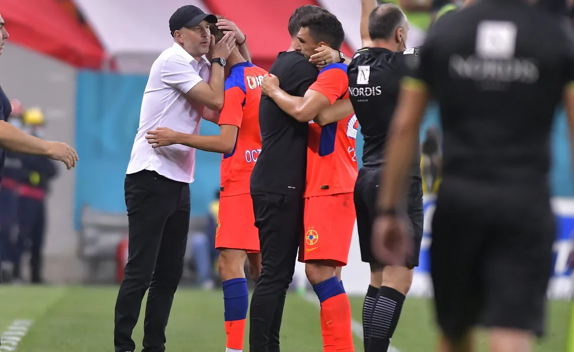 Edward Iordanescu il felicita pe Octavian George Popescu si Mihai Stoica pe Claudiu Andrei Keseru in meciul de fotbal dintre FCSB si Dinamo Bucuresti, contand pentru Liga 1 Casa Pariurilor, desfasurat pe Arena Nationala din Bucuresti, duminica 12 septembrie 2021. © FOTO:Razvan Pasarica/SPORT PICTURES