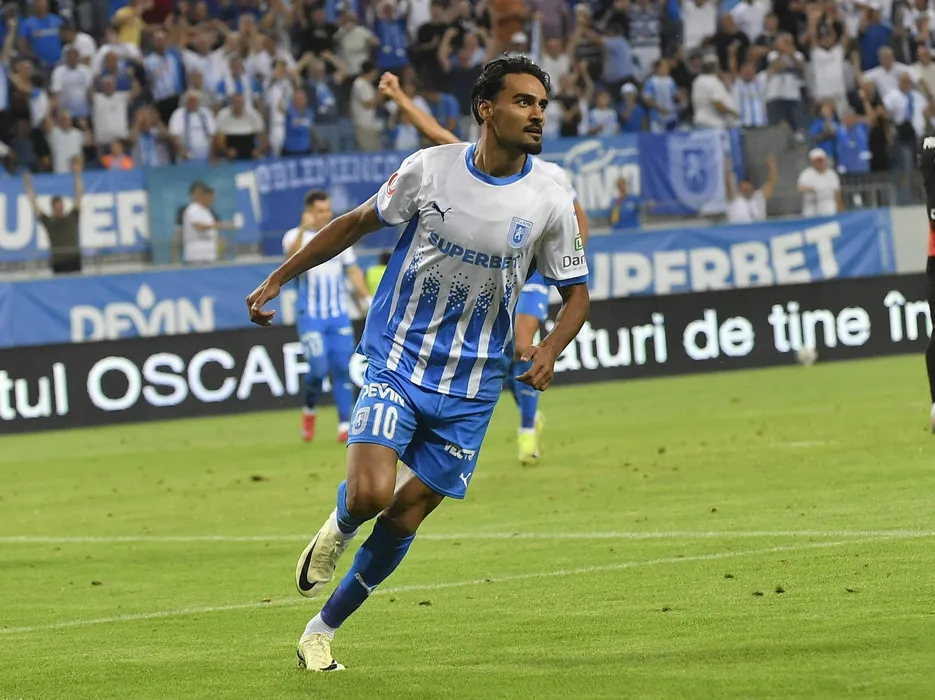 Stefan Baiaram dupa un gol marcat in meciul de fotbal dintre Universitatea Craiova si Spartak Trnava, contand pentru Turul 3 Preliminar al Conference League, desfasurat pe Stadionul Ion Oblemenco din Craiova, joi 7 august 2025. © FOTO:Simion Mechno/SPORT PICTURES