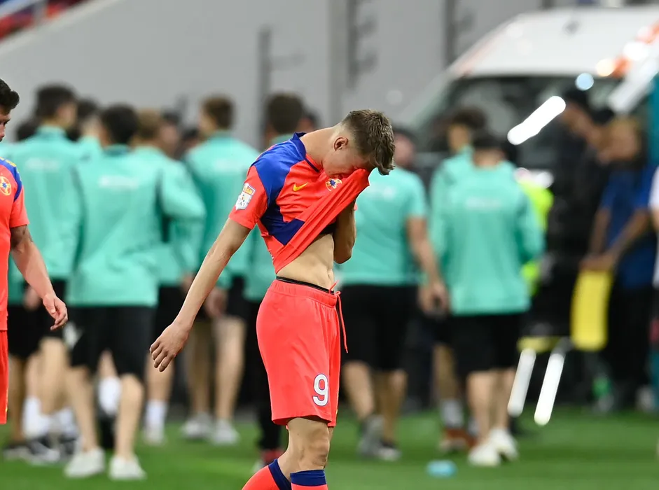 Octavian Popescu, de la FCSB, reactioneaza la finalul meciului de fotbal contra echipei FC Voluntari din etapa a 9- a a play-off-ului Ligii 1, disputat pe Arena Nationala din Bucuresti, sambata, 14 mai 2022. EDUARD VINATORU / MEDIAFAX FOTO