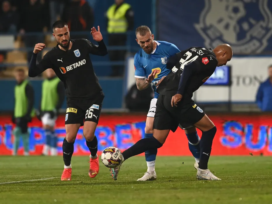 Gjoko Zajkov, Denis Alibec si Raul Michel Melo Da Silva in meciul de fotbal dintre Farul Constanta si Universitatea Craiova, contand pentru Play-off-ul Superligii Superbet, desfasurat pe Stadionul central al Academiei Gheorghe Hagi din Ovidiu, sambata 8 aprilie 2023. © FOTO:Razvan Pasarica/SPORT PICTURES