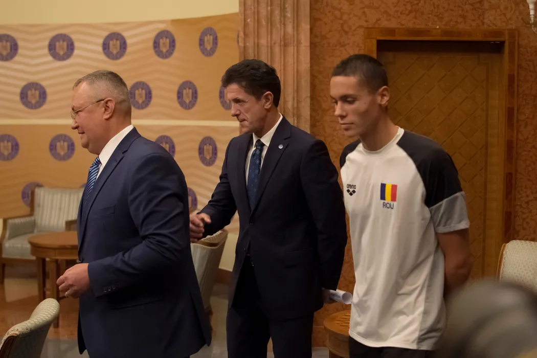 Inotatorul David Popovici a fost primit de premierul Nicolae Ciuca, luni, 27 iunie 2022, la Palatul Victoria din Bucuresti. David Popovici a castigat doua medalii de aur in cadrul Campionatului Mondial de Natatie de la Budapesta, primul sportiv roman cu o asemenea performanta. ALEXANDRU DOBRE / MEDIAFAX FOTO