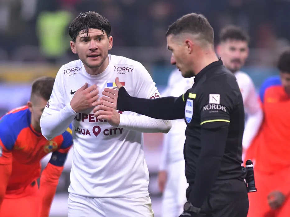 Cristian Ionut Sapunaru discuta cu arbitrul central Istvan Kovacs in meciul de fotbal dintre FCSB si Rapid Bucuresti, contand pentru Liga 1 Casa Pariurilor, desfasurat pe Arena Nationala din Bucuresti, miercuri 15 decembrie 2021. © FOTO:Razvan Pasarica/SPORT PICTURES