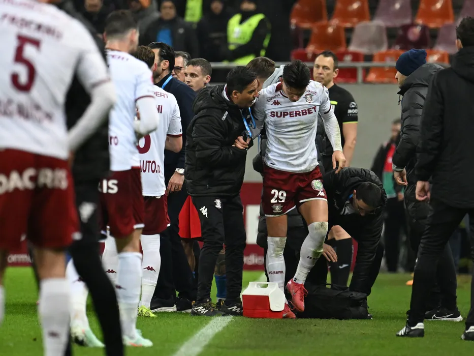 Mihai Alexandru Dobre reactioneaza dupa o accidentare suferita in meciul de fotbal dintre Rapid Bucuresti si FCSB, din cadrul Superligii Superbet, desfasurat pe Arena Nationala din Bucuresti, duminica 2 martie 2025. © FOTO:Razvan Pasarica/SPORT PICTURES