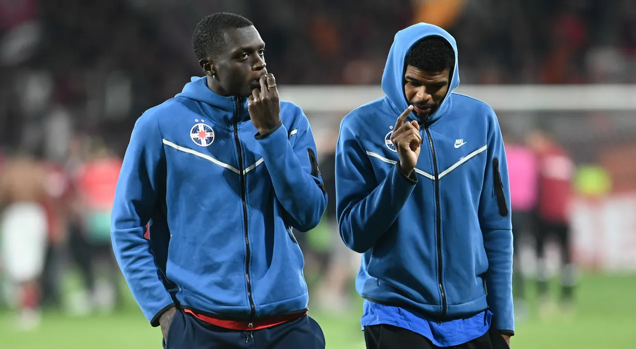 Fotbalistii stelisti Joyskim Aurelien Dawa Tchakonte si Sylas Laouari Edjouma Malcom discuta dupa meciul de fotbal dintre Rapid Bucuresti si FCSB, contand pentru Play-off-ul Superligii Superbet, desfasurat pe Stadionul Rapid Giulesti din Bucuresti, duminica 23 aprilie 2023. © FOTO:Razvan Pasarica/SPORT PICTURES