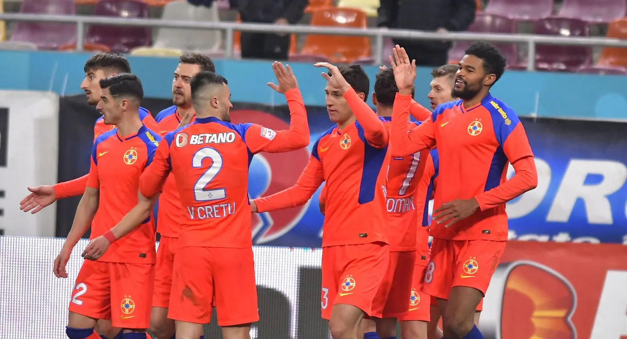 Bucurie a fotbalistilor stelisti dupa un gol marcatcu Iulian Lucian Cristea, Valentin Gheorghe, Andrei George Miron, Valentin Cretu, Risto Radunovic si Sylas Laouari Edjouma Malcom in meciul de fotbal dintre FCSB si Farul Constanta, contand pentru Play-off-ul Ligii 1 Casa Pariurilor, desfasurat pe Arena Nationala din Bucuresti, luni 14 martie 2022. © FOTO:Razvan Pasarica/SPORT PICTURES