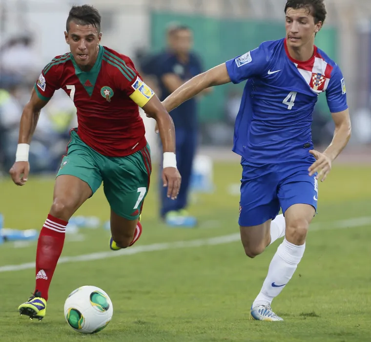 Morocco's Nabil Jaadi (L) fights for the ball with Croatia's Ivan Sunjic during their FIFA U-17 World Cup UAE 2013 football match in the United Arab Gulf emirate of Fujairah, on October 18, 2013.,Image: 174843342, License: Rights-managed, Restrictions: , Model Release: no