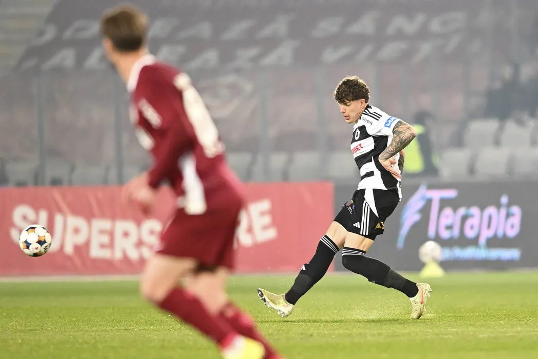 Andrei Coubis (S), de la Universitatea Cluj, suteaza in timpul meciului de fotbal contra echipei CFR Cluj din prima etapa a play-off-ului Superligii, disputat pe Cluj Arena din Cluj-Napoca, luni, 16 martie 2026. FLAVIU BUBOI / MEDIAFAX FOTO