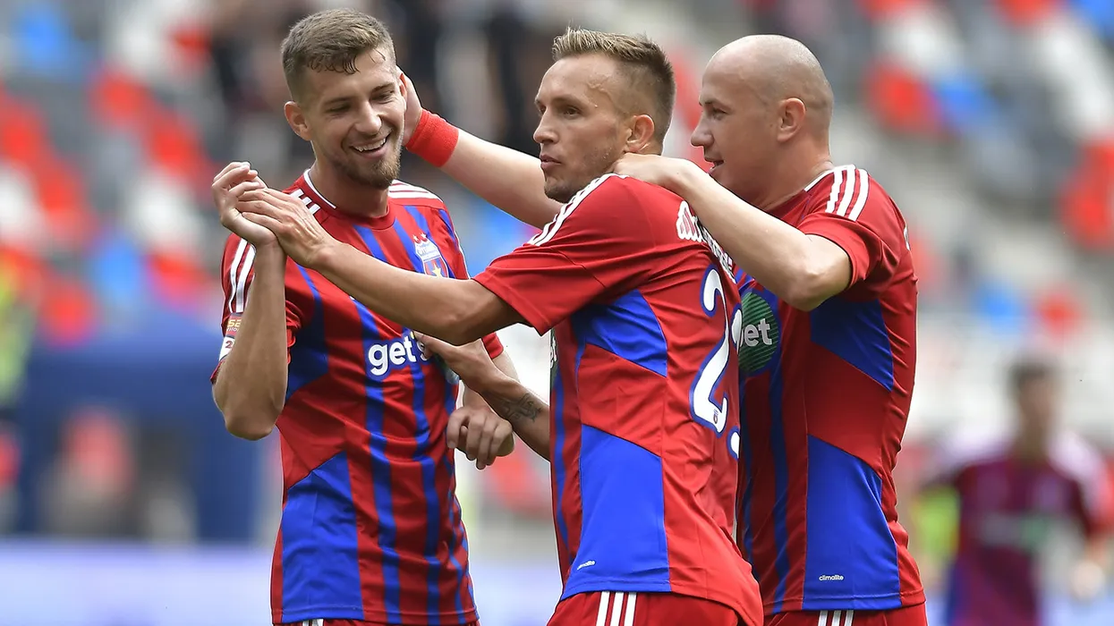 Vasile Buhaescu se bucura dupa un gol marcat alaturi de Stephan Draghici si Madalin Mihaescu in meciul de fotbal dintre Steaua Bucuresti si Ripensia Timisoara, contand pentru Liga a-2-a Casa Pariurilor, desfasurat pe Stadionul Steaua-Ghencea din Bucuresti, duminica 29 august 2021. © FOTO:Razvan Pasarica/SPORT PICTURES