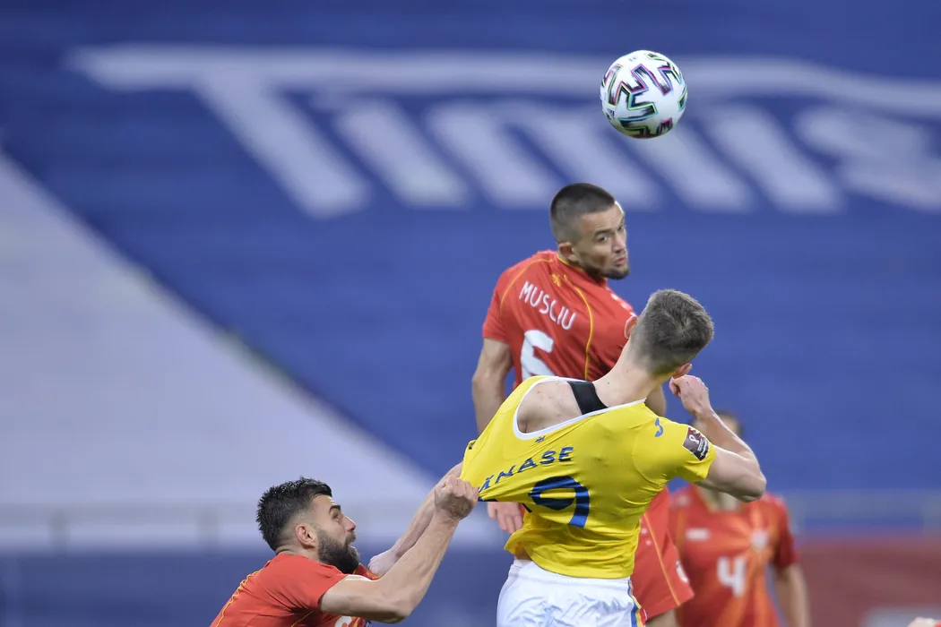Reprezentativele Romaniei (echipament galben) si Macedoniei de Nord s-au intalnit intr-o partida contand pentru preliminariile CM 2022, joi 25 noiembrie 2021, pe Arena Nationala din Bucuresti. ALEXANDRU DOBRE / MEDIAFAX FOTO