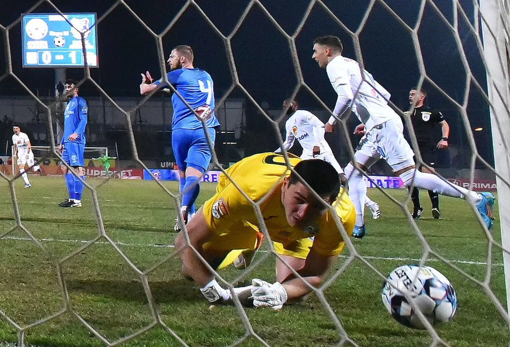 Andrei Gabriel Ureche la pamant dupa un gol incasat sub privirile lui Pavel Cmovs si Jefte Betancor Sanchez la meciul de fotbal dintre Academica Clinceni si Farul Constanta, restanta contand pentru Liga 1 Casa Pariurilor, desfasurat pe Stadionul Marin Anastasovici din Giurgiu, joi 17 februarie 2022. © FOTO:Razvan Pasarica/SPORT PICTURES