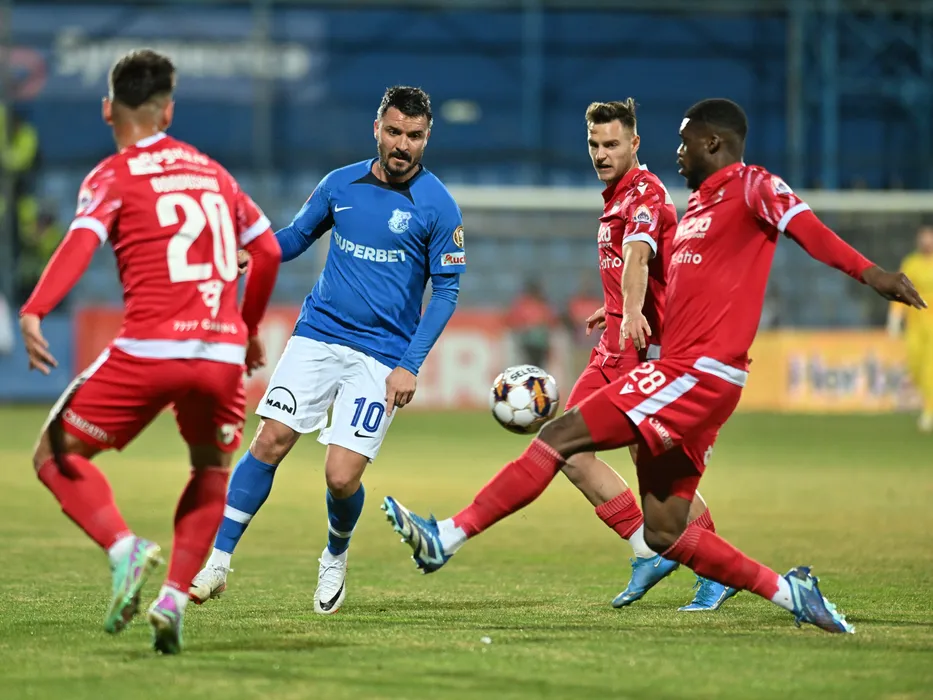 Constantin Valentin Budescu, Dennis Dorin Politic si Josue Francis Homawoo în meciul de fotbal dintre Farul Constanta si Dinamo Bucuresti, contând pentru Superliga Superbet, desfășurat pe Stadionul central al Academiei Gheorghe Hagi din Ovidiu, luni 12 februarie 2024. © FOTO: Răzvan PĂSĂRICĂ/SPORT PICTURES