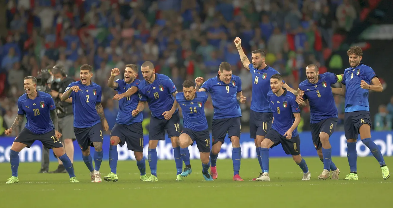 Italy players react during a penalty shootout after extra time during of the Euro 2020 soccer championship final match between England and Italy at Wembley stadium in London, Sunday, July 11, 2021. (Carl Recine/Pool Photo via AP)