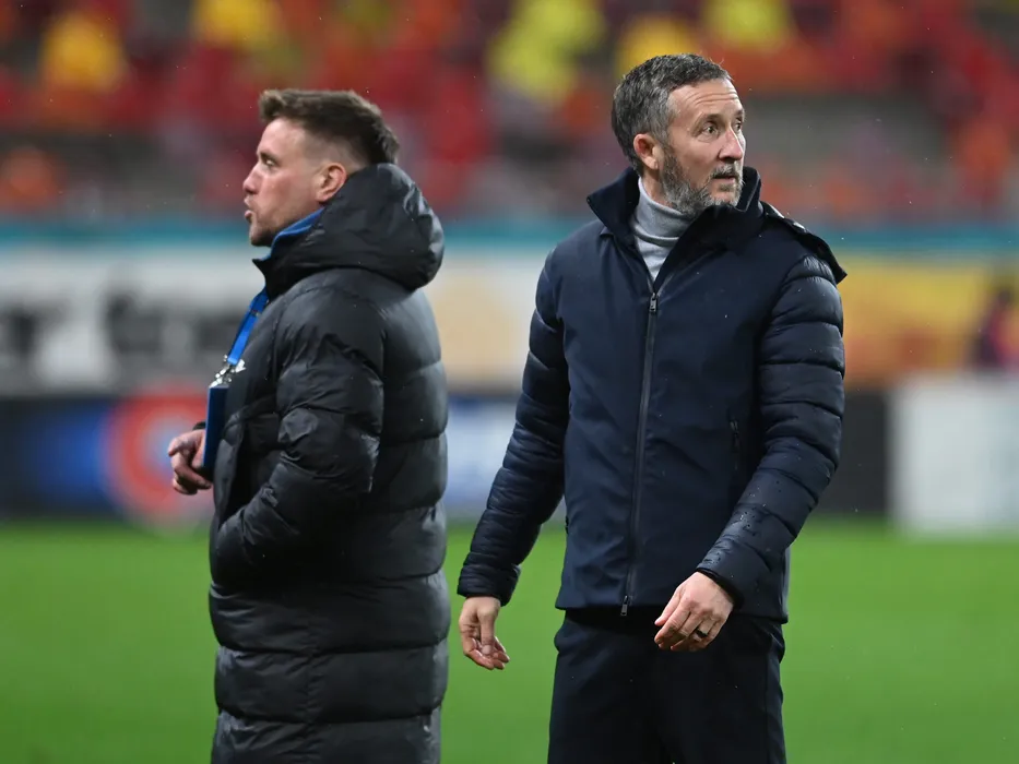 Mihai Pintilii si Mihai Stoica discuta dupa meciul de fotbal dintre FCSB si Farul Constanta, contand pentru Play-off-ul Superligii Superbet, desfasurat pe Arena Nationala din Bucuresti, luni 17 aprilie 2023. © FOTO:Razvan Pasarica/SPORT PICTURES