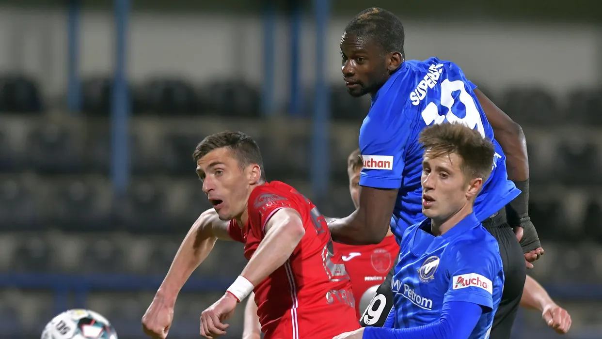 Ionut Justinian Larie, Juvhel Fred Tsoumou Hama si Ion Gaztanaga Arrospide in meciul de fotbal dintre FC Viitorul Constanta si Gaz Metan Medias, din cadrul Ligii 1 Casa Pariurilor, desfasurat fara spectatori pe Stadionul Central al Academiei Gheorghe Hagi din Ovidiu, luni 12 aprilie 2021. © FOTO:Razvan Pasarica/SPORT PICTURES