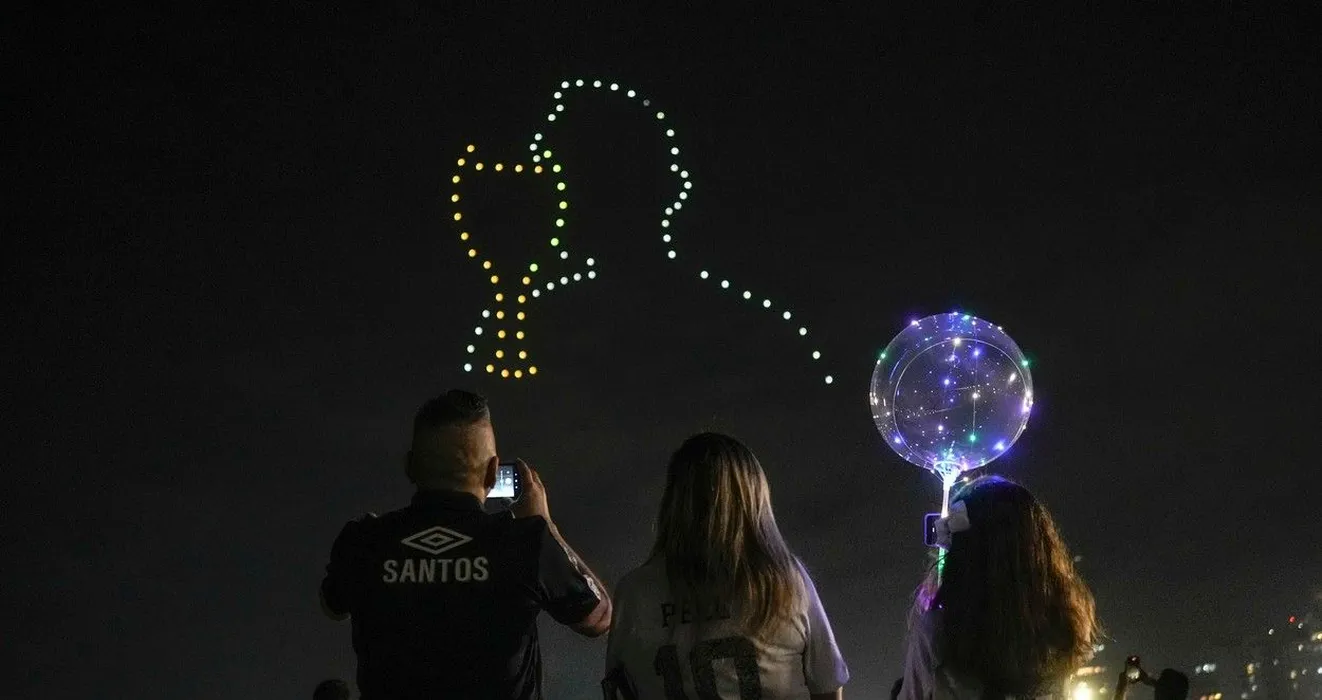 People watch a drone show in homage to the late Brazilian soccer star Pele, over Gonzaga Beach in Santos, Brazil, Saturday, Dec. 31, 2022. Pele, who played most of his career with Santos, died in Sao Paulo on Thursday at the age of 82.,Image: 747179354, License: Rights-managed, Restrictions: This content is intended for editorial use only. For other uses, additional clearances may be required., Model Release: no, Pictured: Pele