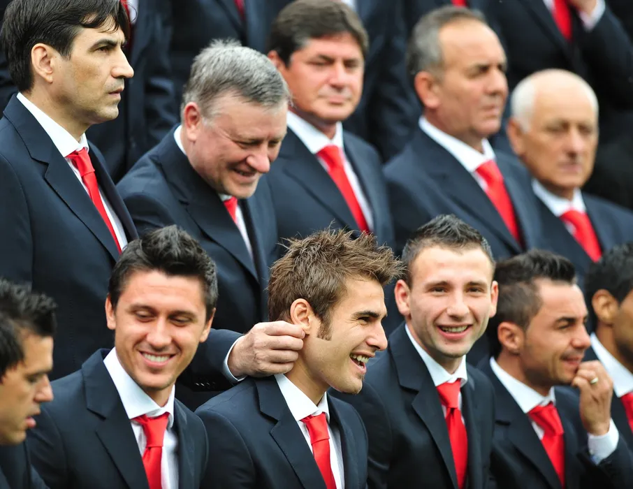 Romania's football player Adrian Mutu (second, down) is pulled by the year by Mircea Sandu, the Romanian Football Federation chairman (second, up) during the official photo at final preparation stage prior to the EURO 2008 at the Mogosoaia Center next to Bucharest, on May 23, 2008. AFP PHOTO DANIEL MIHAILESCU / RESTRICTED TO EDITORIAL USE,Image: 25545006, License: Rights-managed, Restrictions: RESTRICTED TO EDITORIAL USE, Model Release: no