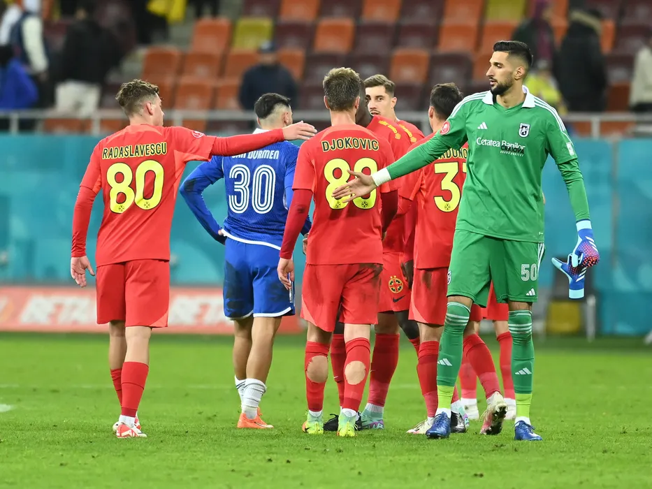 Eduard Gabriel Radaslavescu si Ion Cristian Gurau se saluta dupa meciul de fotbal dintre FCSB si FC U Craiova, din cadrul Superligii Superbet, desfasurat pe Arena Nationala din Bucuresti, duminica 12 noiembrie 2023. © FOTO:Razvan Pasarica/SPORT PICTURES
