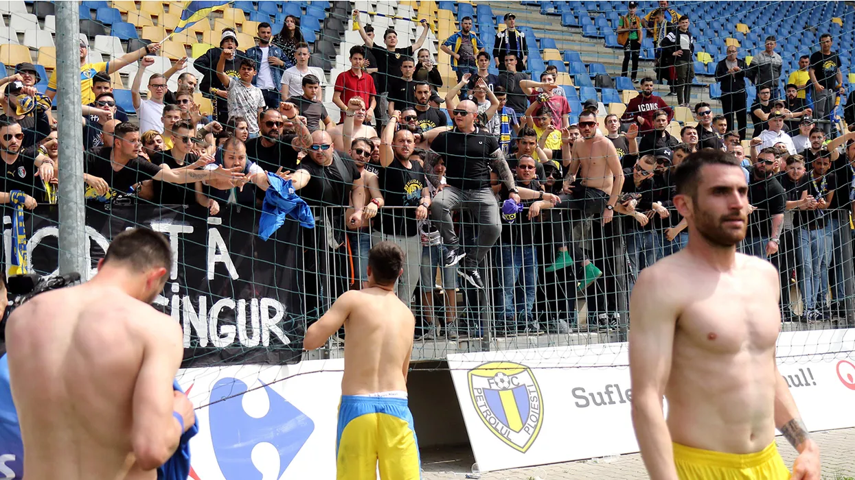 Fotbalistii Petrolului suparati alaturi de suporteri dupa meciul de fotbal dintre Petrolul Ploiesti si ASC Daco Getica Bucuresti, contand pentru Liga a-2-a Casa Pariurilor, desfasurat pe Stadionul Ilie Oana din Ploiesti, sambata 27 aprilie 2019. © FOTO:Gheorghe Fluster/SPORT PICTURES