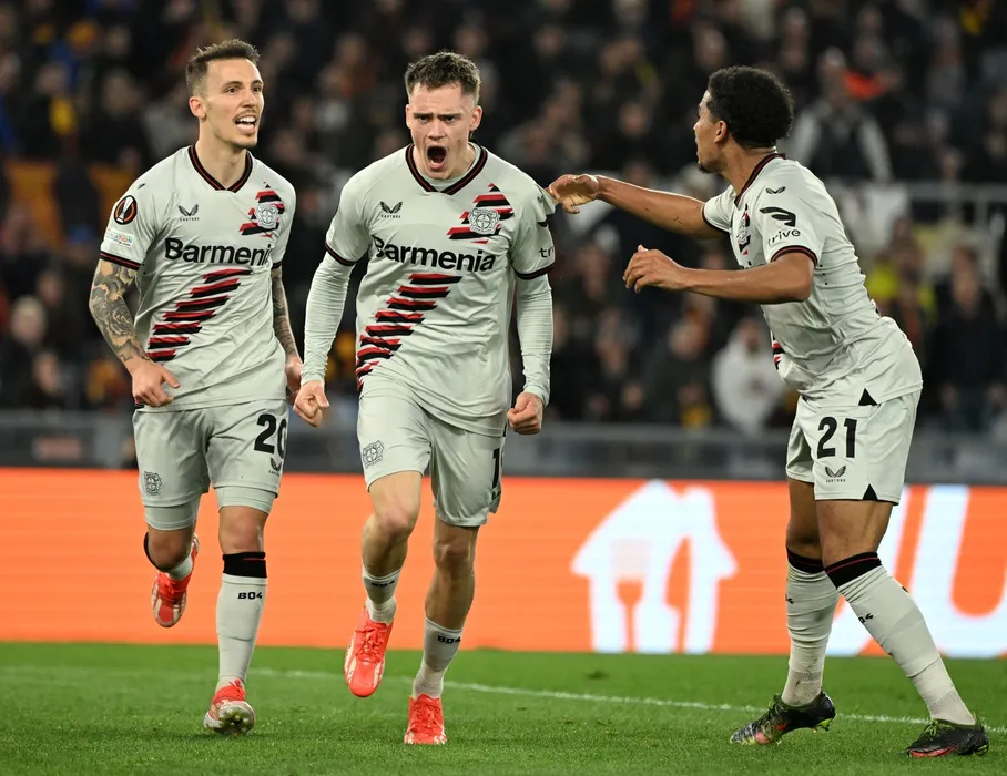 ROME, May 3, 2024 -- Bayer 04 Leverkusen's Florian Wirtz (C) celebrates his goal with teammates during the UEFA Europa League semifinal 1st leg match between Roma and Bayer 04 Leverkusen in Rome, Italy, May 2, 2024.,Image: 869775648, License: Rights-managed, Restrictions: , Model Release: no