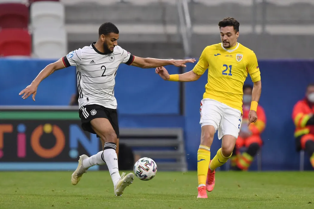 Germany's defender Josha Vagnoman (L) and Romania's forward Adrian Petre vie for the ball during the UEFA Under21 Championship group stage football match Germany'sy v Romania in Budapest, on March 30, 2021.,Image: 602356978, License: Rights-managed, Restrictions: , Model Release: no