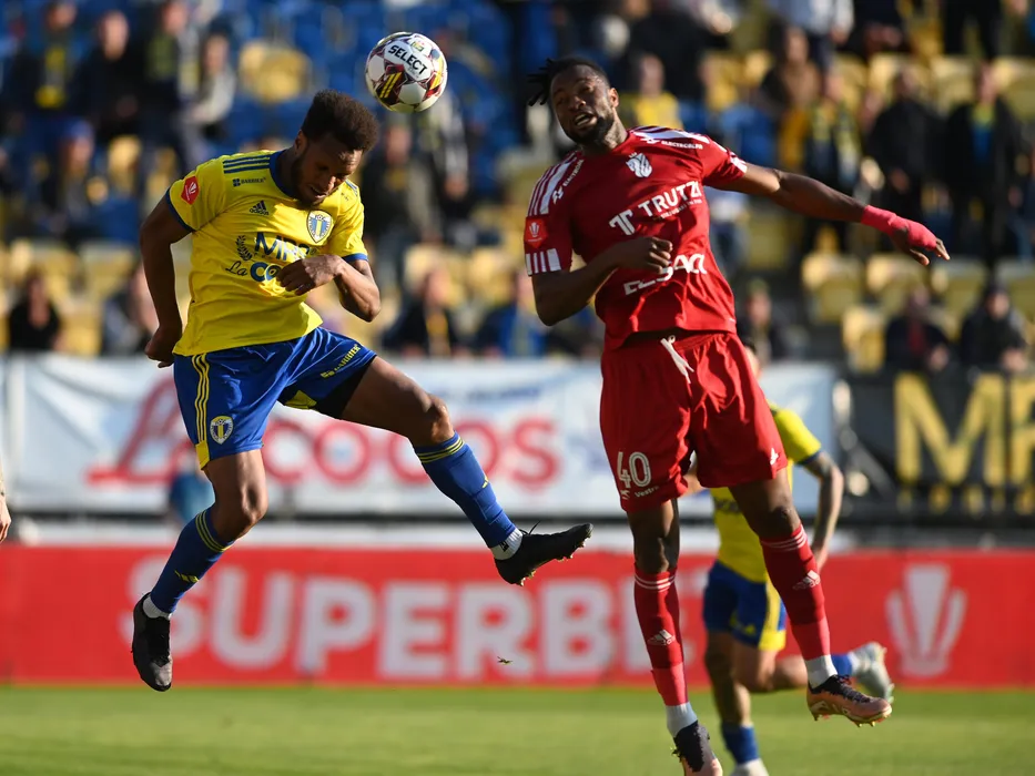 Felix Mathaus Lima Santos si Udeme Junior Pius in meciul de fotbal dintre Petrolul Ploiesti si FC Botosani, contand pentru Play-out-ul Superligii Superbet, desfasurat pe Stadionul Ilie Oana din Ploiesti, sambata 29 aprilie 2023. © FOTO:Razvan Pasarica/SPORT PICTURES