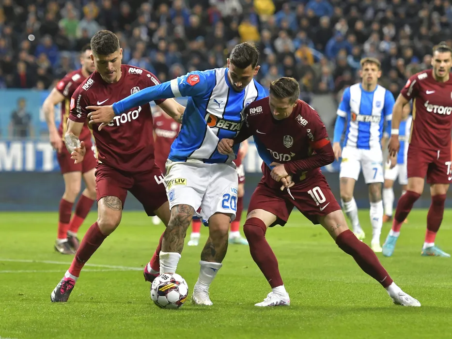 Jefferson Yuri De Sousa Matias, Jovan Markovic si Ciprian Ioan Deac in meciul de fotbal dintre Universitatea Craiova si CFR Cluj, contand pentru Play-off-ul Superligii Superbet, desfasurat pe Stadionul Ion Oblemenco din Craiova, duminica 2 aprilie 2023. © FOTO:Razvan Pasarica/SPORT PICTURES