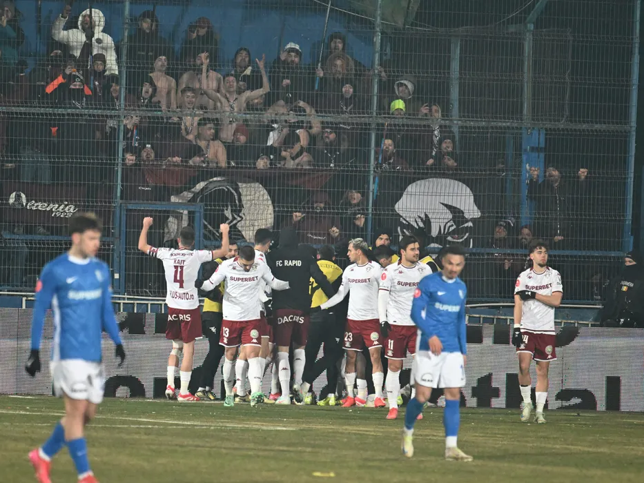 Fotbalistii rapidisti se bucura dupa un gol marcat alături de suporterii din galerie la meciul de fotbal dintre Farul Constanta si Rapid Bucuresti, contand pentru Superliga Superbet, desfasurat pe Stadionul central al Academiei Gheorghe Hagi din Ovidiu, luni 24 februarie 2025. © FOTO:Razvan Pasarica/SPORT PICTURES