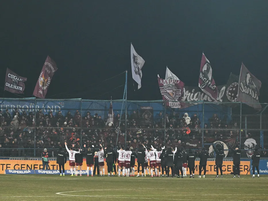 Fotbalistii rapidisti saluta galeria dupa meciul de fotbal dintre Farul Constanta si Rapid Bucuresti, contand pentru Superliga Superbet, desfasurat pe Stadionul central al Academiei Gheorghe Hagi din Ovidiu, luni 24 februarie 2025. © FOTO:Razvan Pasarica/SPORT PICTURES