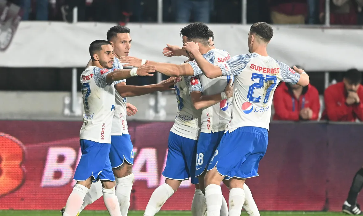 Bucurie a fotbalistilor constanteni Enes Sali, Robert Marian Moldoveanu si Andrei Viorel Artean dupa un gol marcat in meciul de fotbal dintre Rapid Bucuresti si Farul Constanta, contand pentru Cupa Romaniei, desfasurat pe Stadionul Rapid Giulesti din Bucuresti, miercuri 9 noiembrie 2022. © FOTO:Razvan Pasarica/SPORT PICTURES