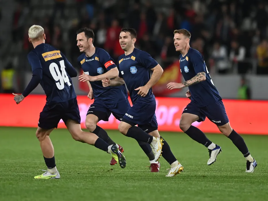 Bucurie a fotbalistilor ieseni dupa un gol marcat cu Razvan Tincu, Alin Roman si Matija Katanec in meciul de fotbal dintre Dinamo Bucuresti si Politehnica Iasi, contand pentru Play-off-ul Ligii a-2-a, desfasurat pe Stadionul National Arcul de Triumf din Bucuresti, marti 25 aprilie 2023. © FOTO:Razvan Pasarica/SPORT PICTURES
