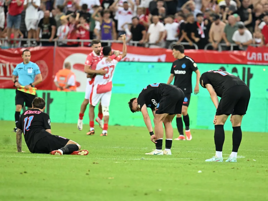Fotbalistii ros-albastrii David Raul Miculescu, Dennis Politic si Mihai Popescu dezamagiti dupa meciul de fotbal dintre Dinamo Bucuresti si FCSB, contand pentru Superliga Superbet, desfasurat pe Arena Nationala din Bucuresti, sambata 2 august 2025. © FOTO:Razvan Pasarica/SPORT PICTURES