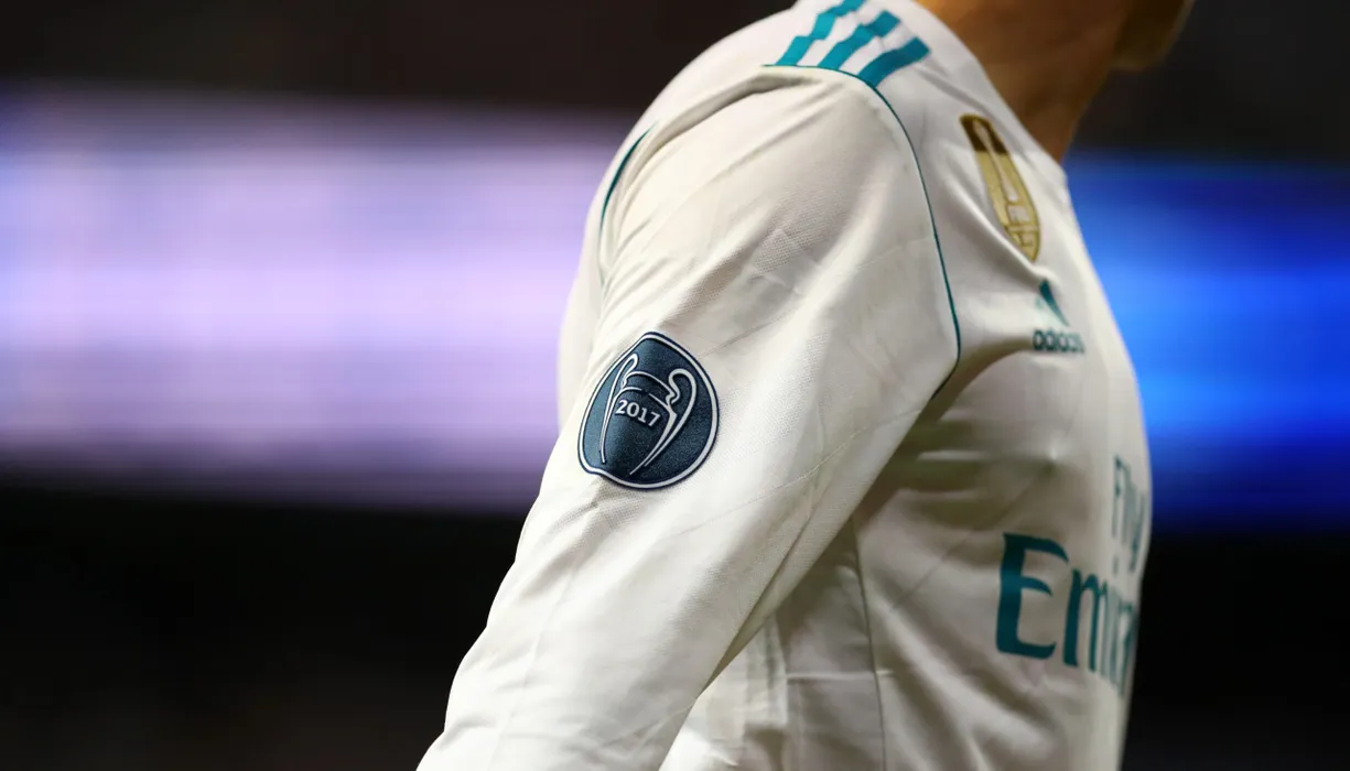 MADRID, SPAIN - MAY 01: Detail of the 2017 Champions League winners badge on the sleeve of a Real Madrid shirt during the UEFA Champions League Semi Final Second Leg match between Real Madrid and Bayern Muenchen at the Bernabeu on May 1, 2018 in Madrid, Spain. (Photo by Catherine Ivill/Getty Images)