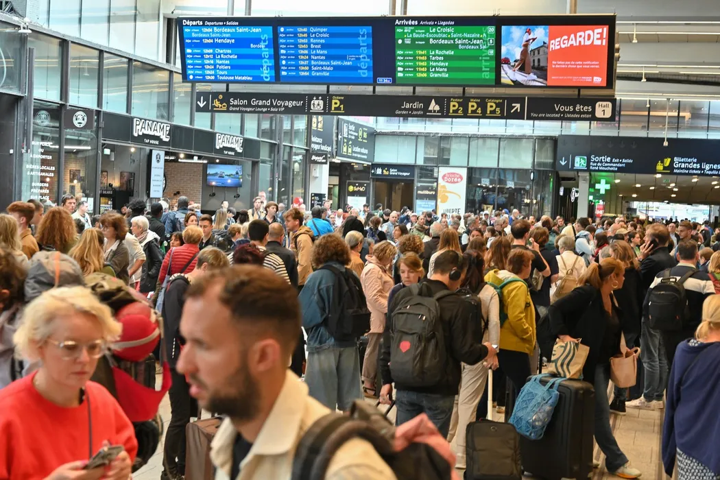 France, Paris, July 3 2024. Passengers with their suitcases and luggage are looking at the train schedule display screens in the main hall of SNCF Paris Montparnasse station. Illustration of Paris Montparnasse station. Photograph by Henrique Campos / Hans Lucas.