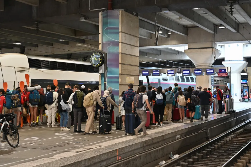France, Paris, July 3 2024. Passengers with their suitcases and luggage are walking on the platform towards their TGV (high-speed train). Illustration at Paris Montparnasse station. Photograph by Henrique Campos / Hans Lucas.