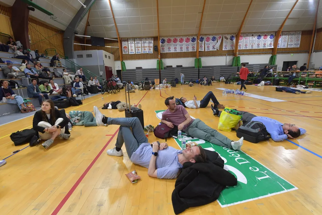 Some of the 1,200 passengers travelling on TGV train 8931 Paris-Nantes are waiting in a gymnasium in Sable-sur-Sarthe, western France, after being evacuated due to a strong, unpleasant smell coming from a wagon toilet, July 12, 2024. After several hours of waiting and uncertainty, 1,200 passengers on a Paris-Nantes TGV, evacuated on the evening of July 12 at Sablé-sur-Sarthe (Sarthe) due to a "strong and unpleasant smell" coming from the toilets, were able to resume their journey, as analyses had detected no harmful substances, according to the prefecture.,Image: 889160168, License: Rights-managed, Restrictions: , Model Release: no
