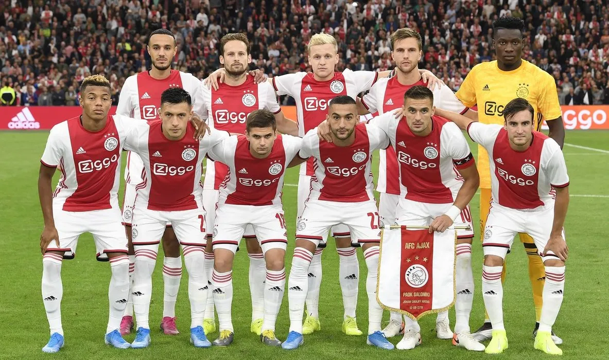 Back row: Ajax player Noussair Mazraoui, Ajax player Daley Blind, Ajax player Donny van de Beek, Ajax player Joel Veltman and Ajax goalkeeper Andre Onana