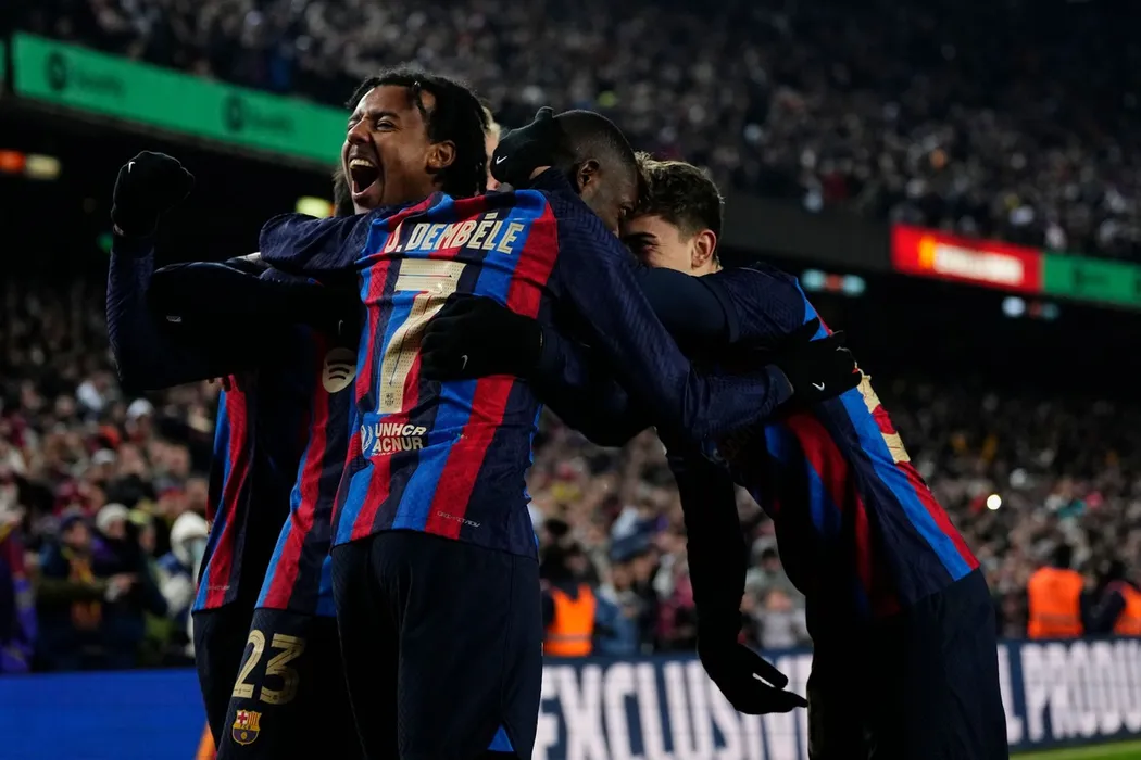 Ousmane Dembele right winger of Barcelona and France celebrates after scoring his sides first goal during the Copa Del Rey Quarter Final match between FC Barcelona and Real Sociedad at Spotify Camp Nou on January 25, 2023 in Barcelona, Spain.