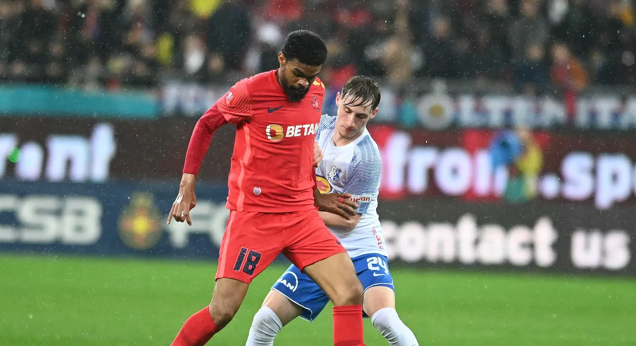 Sylas Laouari Edjouma Malcom si Constantin Grameni in meciul de fotbal dintre FCSB si Farul Constanta, contand pentru Play-off-ul Superligii Superbet, desfasurat pe Arena Nationala din Bucuresti, luni 17 aprilie 2023. © FOTO:Razvan Pasarica/SPORT PICTURES