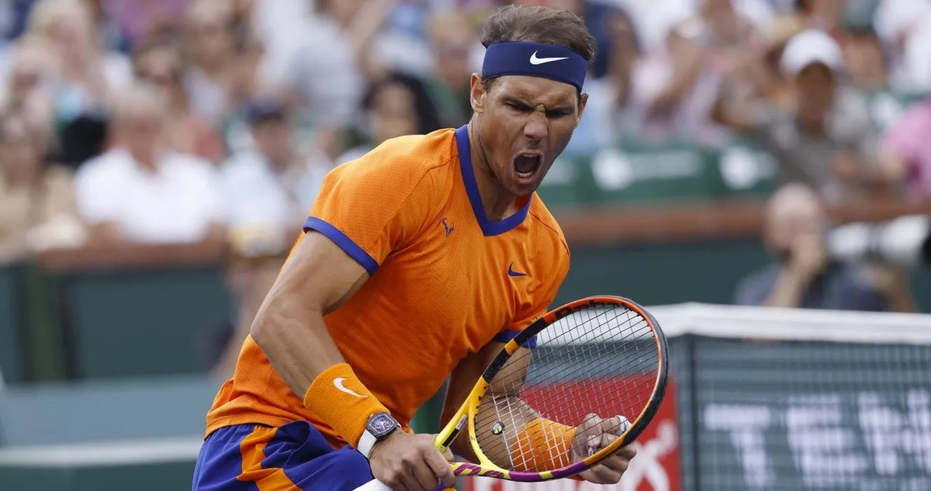 Rafael Nadal of Spain reacts to winning a point against Carlos Alcaraz of Spain during the semifinals match of the BNP Paribas Open at Indian Wells Tennis Garden in Indian Wells, California