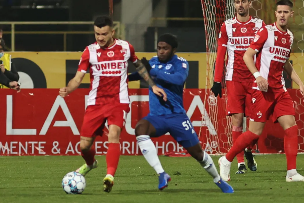 Echipele Dinamo (echipament rosu) si U Craiova 1984 s-au intalnit intr-o partida disputata in etapa cu numarul 17 din Liga 1 de fotbal, vineri, 26 noiembrie 2021, in Bucuresti. GEORGE FLUSTER / MEDIAFAX FOTO