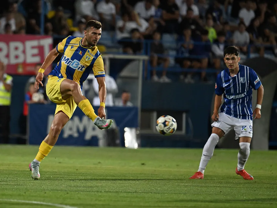 Adi Marian Chica Rosa si Cristian Sima in meciul de fotbal dintre Farul Constanta si Petrolul Ploiesti, contand pentru Superliga Superbet, desfasurat pe Stadionul central al Academiei Gheorghe Hagi din Ovidiu, luni 1 septembrie 2025. © FOTO:Razvan Pasarica/SPORT PICTURES
