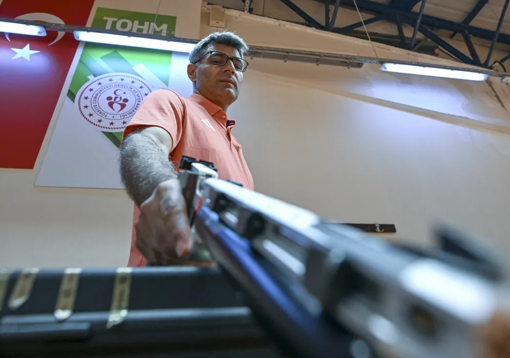 ANKARA, TURKIYE - AUGUST 02: Yusuf Dikec, a Turkish Olympic silver medalist shooter who shoots without special equipment in the mixed team 10-metre air pistol category in Olympic Games Paris 2024 and won the silver medal with Sevval Ilayda Tarhan in the same category, is seen during an exclusive interview in Ankara, Turkiye on August 01, 2024. Yusuf Dikec, a Turkish Olympic silver medalist shooter, said Thursday that he does not favor using equipment like lenses, eye caps, or ear protection during competitions and that he feels quite uncomfortable with such gear. Turkish shooter's picture hitting silver medal with minimal gear at Olympics attracts global netizens. Utku Ucrak / Anadolu/ABACAPRESS.COM