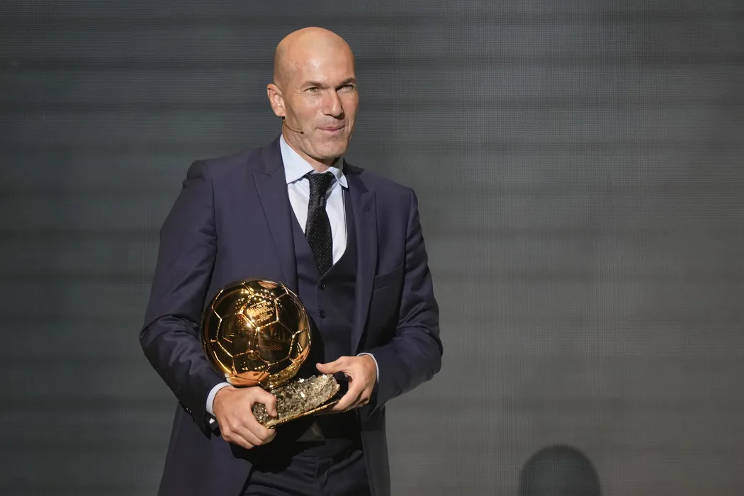 Former soccer player and manager Zinedine Zidane presents the 2022 Ballon d'Or trophy during the 66th Ballon d'Or ceremony at Theatre du Chatelet in Paris, France, Monday, Oct. 17, 2022. (AP Photo/Francois Mori)